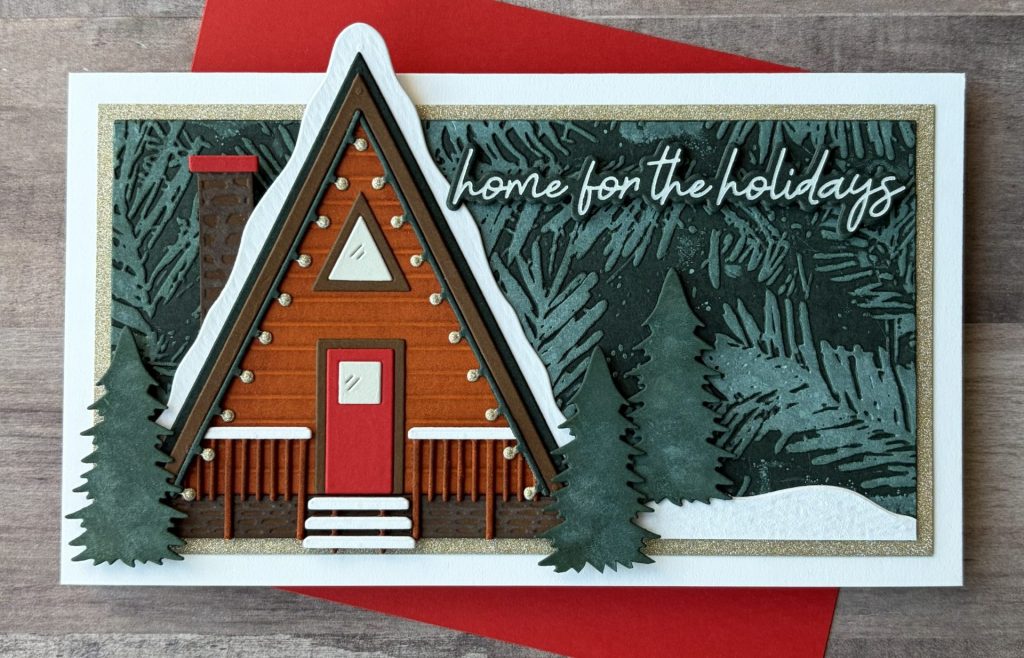 The star of this design is the dimensional A-frame cabin, built from layered die cuts that instantly create a cozy focal point. I used warm wood tones and pops of red on the door to make the house feel inviting, then added small details like trim, lights, and railing pieces to really bring it to life. Behind the cabin, the embossed evergreen background adds wonderful texture and depth while keeping the color palette calm and wintry. The snowy hillside and layered trees help ground the scene and give it that storybook winter setting. To finish it off, the scripted sentiment stretches across the background, tying everything together with a soft, elegant holiday message.
