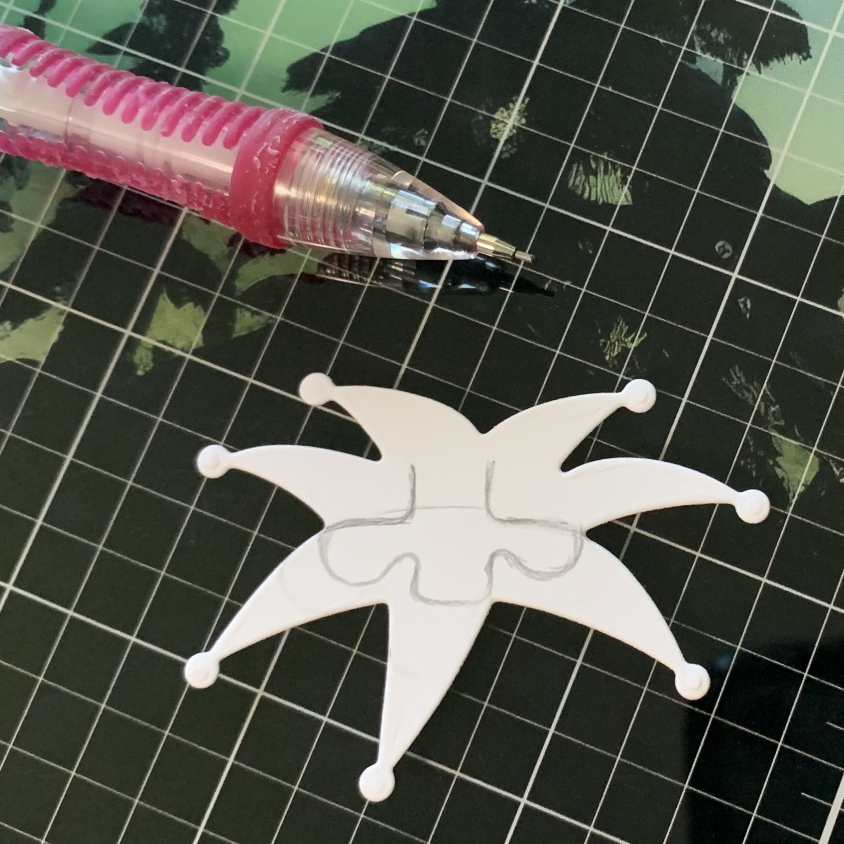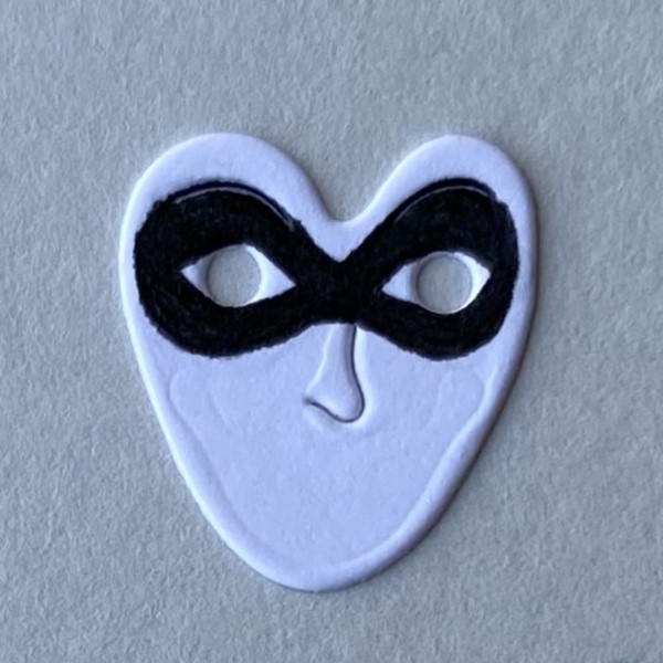 To give her a classic Harley Quinn mask, I lightly sketched the shape with pencil directly onto the die-cut face, then carefully inked it using a 005 black Micron pen.